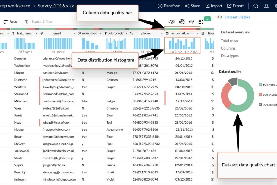 DataPrep offers numerous options to measure and improve the quality of your data. Data quality can be assessed from the following areas in the data prep page. - Data quality bar